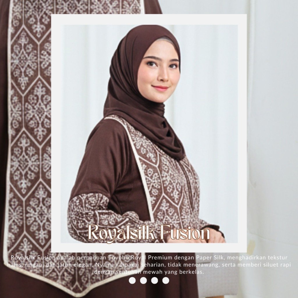 Royalsilk Fusion adalah perpaduan Toyobo Royal Premium dengan Paper Silk, menghadirkan tekstur halus, ringan, dan jatuh elegan. Nyaman dipakai seharian, tidak menerawang, serta memberi siluet rapi dengan sentuhan mewah yang berkelas.